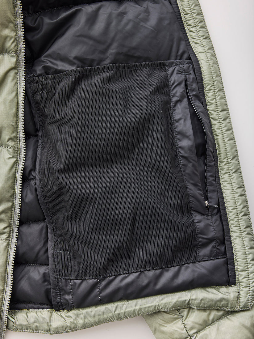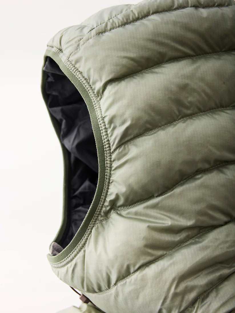 保温性と収納性のバランスが良く、静的保温性重視のミッドレイヤーとしても、単体で着るアウターとしても使えるミッドウェイトのダウンです。フィールドでも街でも、冬はもちろん夏の高山でも、さまざまなシチュエーションで使用可能。中綿にアライド社製850フィルパワー撥水ダウンを100g充填。今季は表生地を変更するとともに、ダウンのロフトを最大限に活かせるようにキルトデザインを見直しました。体幹部はキルト幅を大きくしてデッドエアを蓄え、よく動く腕や擦れやすいサイドは幅を狭くしてダウンの偏りを抑えています。